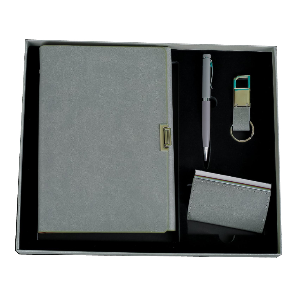 Keep your recipient organized and stylish with this essential gift set featuring a notebook, business cardholder, keyholder, and pen.